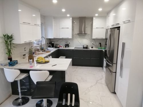 Rénovation de cuisine avec des armoires en polymère de haute qualité, alliant esthétisme et praticité pour un espace de vie accueillant et moderne.